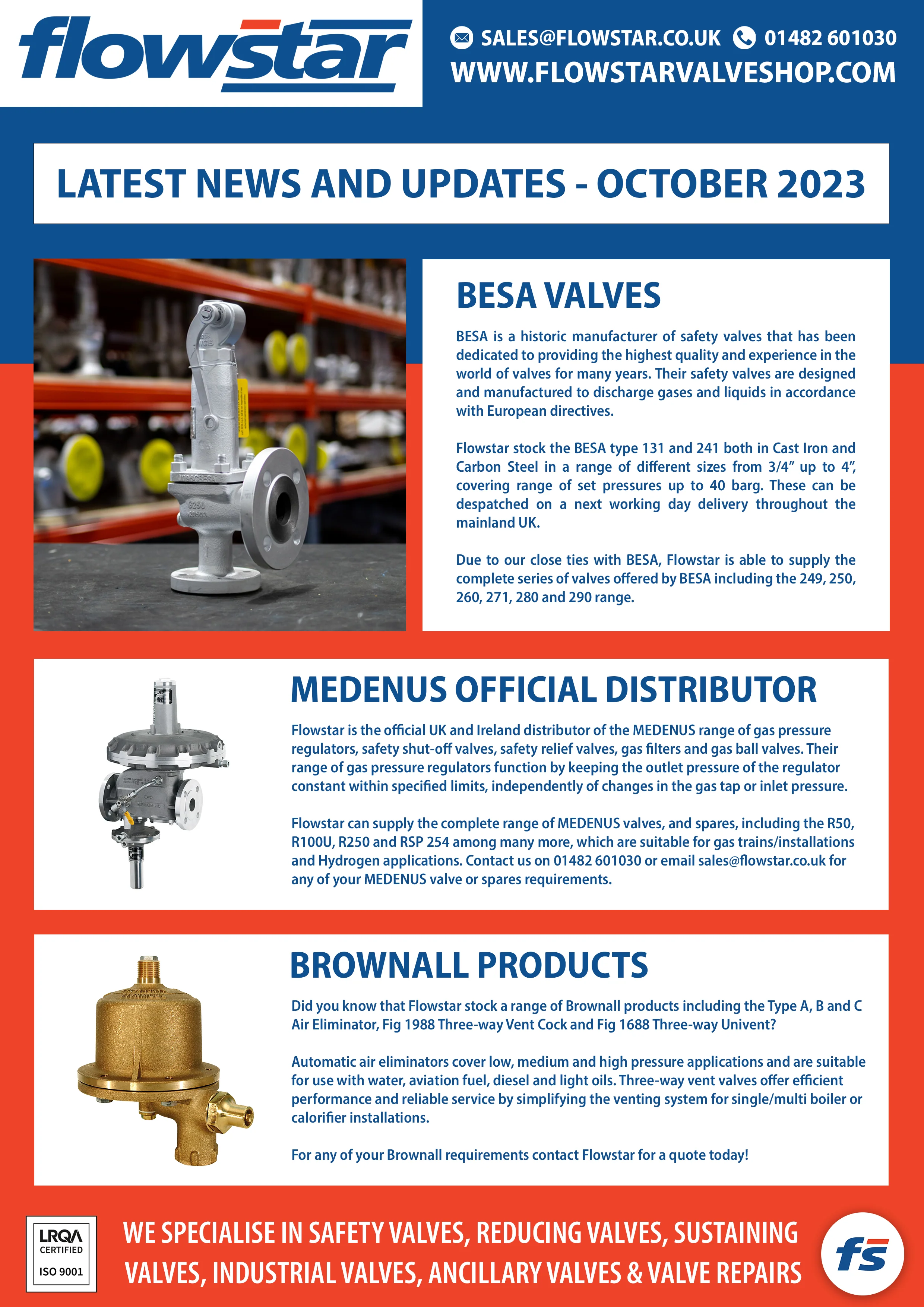 In the October edition of our latest news and updates flyer you can find details of the different models of valves that we can supply, specifically from BESA, Medenus and Brownall.