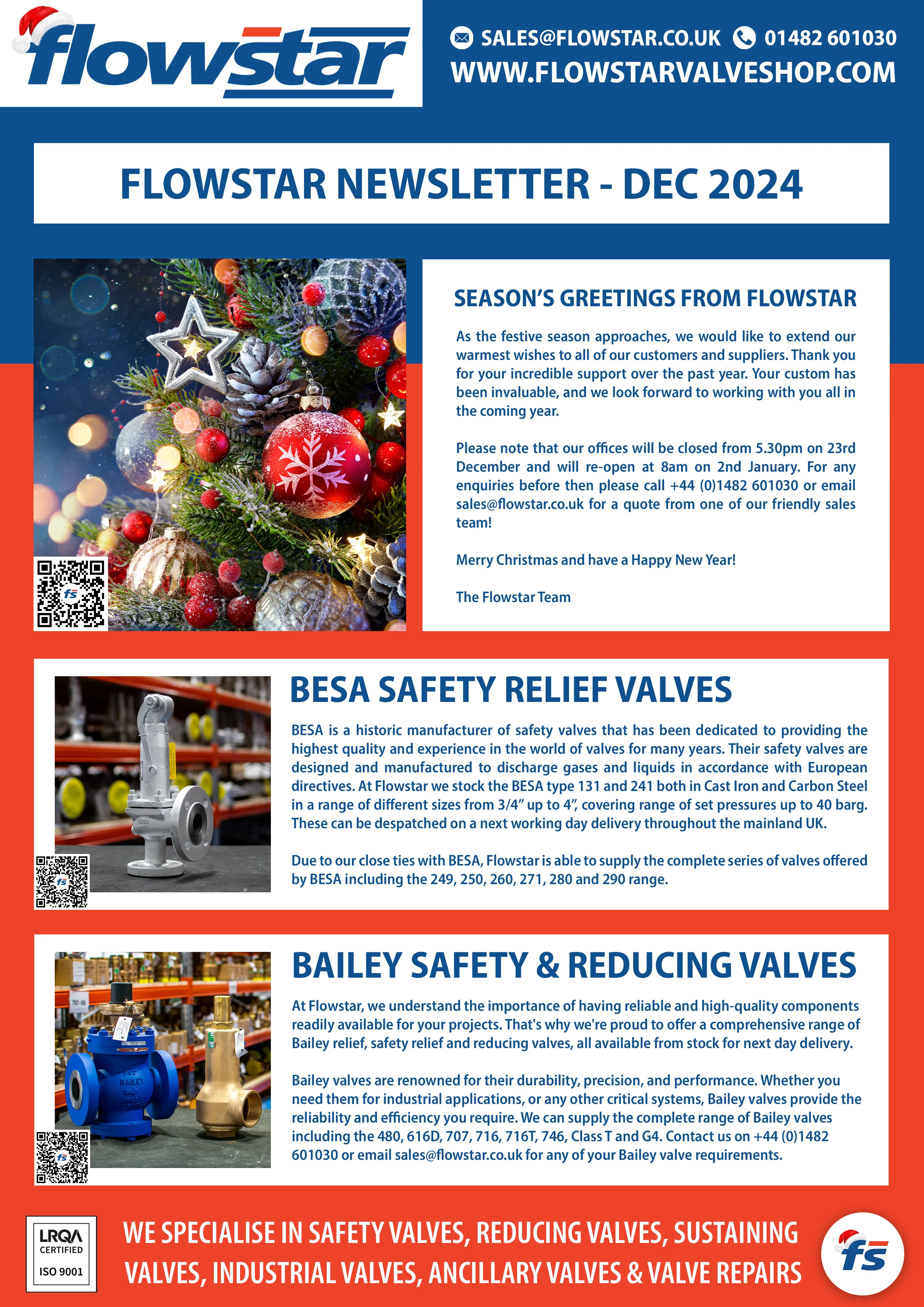 In our latest newsletter, you can find details of our Christmas opening times, along with information about the BESA safety relief valves and Bailey safety relief and pressure reducing valves which we have in stock, available on a next working day delivery.