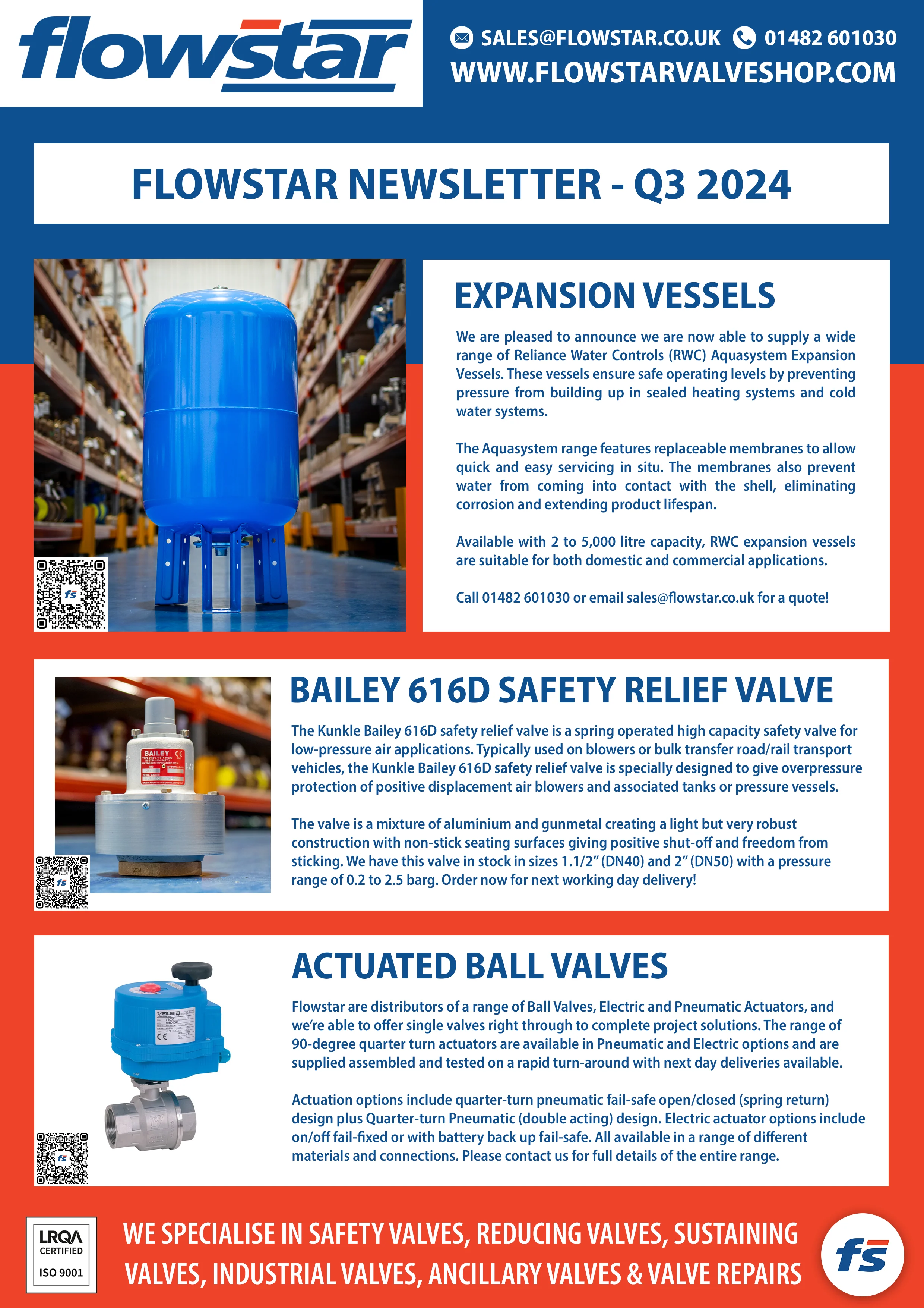 In our latest newsletter you can find details of the new range of RWC Aquasystem Expansion Vessels that we are now able to supply. Also featuring is the Bailey 616D Safety Relief Valve, which we have in stock and available on a next working day delivery. Finally, there are details of the range of Actuated Ball Valves which Flowstar are distributors of.